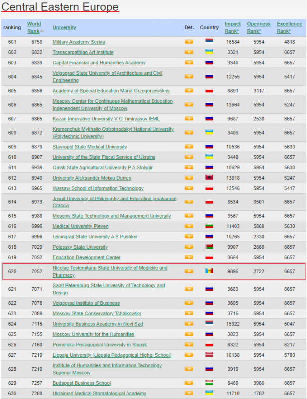Conform raportului publicat de Ranking Web of Universities în data de 27 ianuarie curent, instituția noastră ocupă locul 7052 la nivel mondial, față de 7153 acum un an. Universitatea și-a păstrat poziția a treia printre cele 25 de universități din Republica Moldova, incluse în clasament, și se regăsește pe locul 1826 la nivel continental, iar în Europa Centrală și de Est – 620.