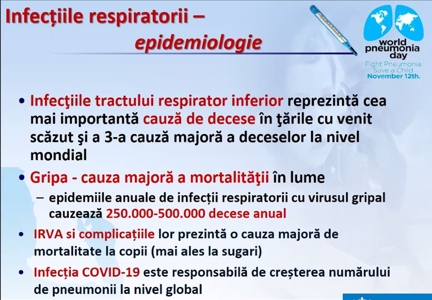 „Prin marcarea Zilei Mondiale a Pneumoniei se contează pe promovarea intervențiilor pentru a proteja copiii, dar și pe generarea de acțiuni pentru a combate pneumonia și alte boli comune, uneori letale. În acest mod se pune accent pe conjugarea eforturilor, pe lansarea de acțiuni și investiții social-economice semnificative, dar și pe fortificarea sistemelor de sănătate. Pneumonia poate fi prevenită prin imunizare, nutriție adecvată și abordarea factorilor de mediu”, a afirmat profesorul Svetlana Șciuca.